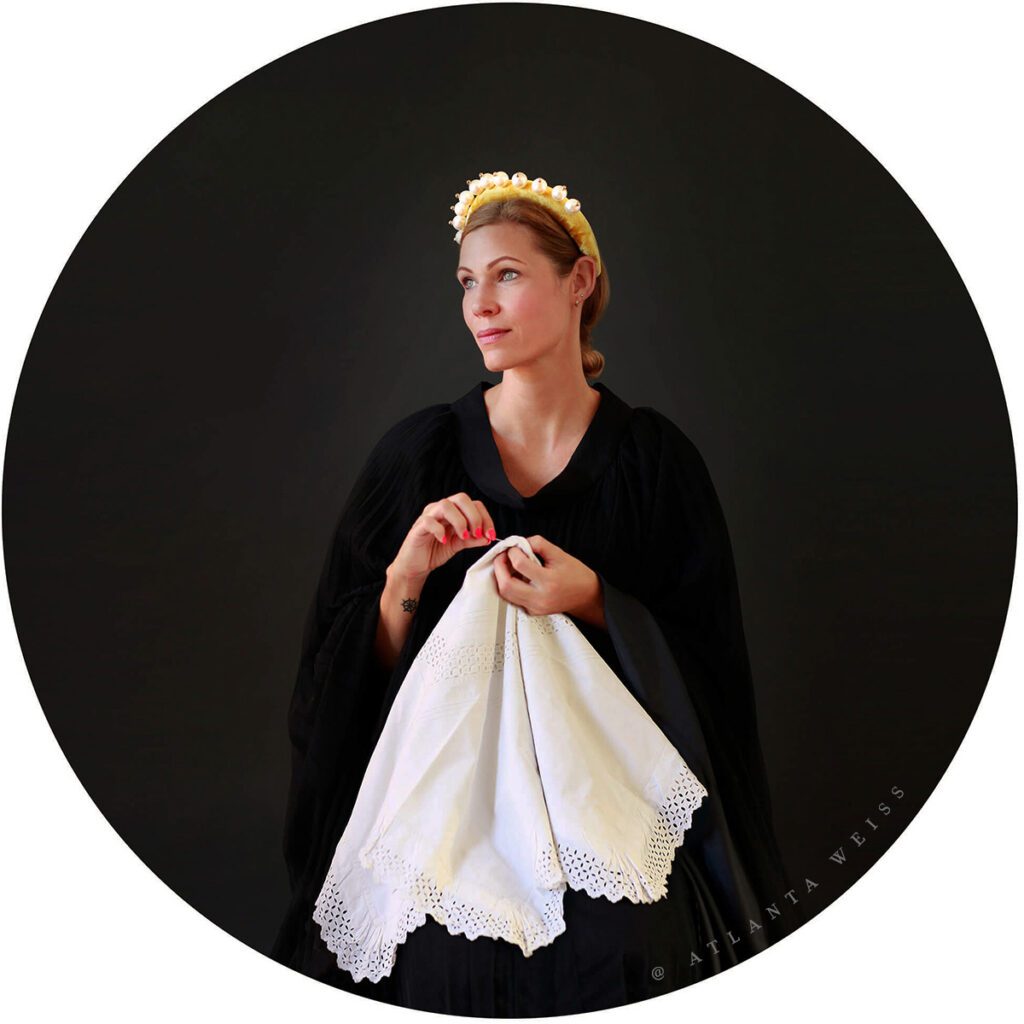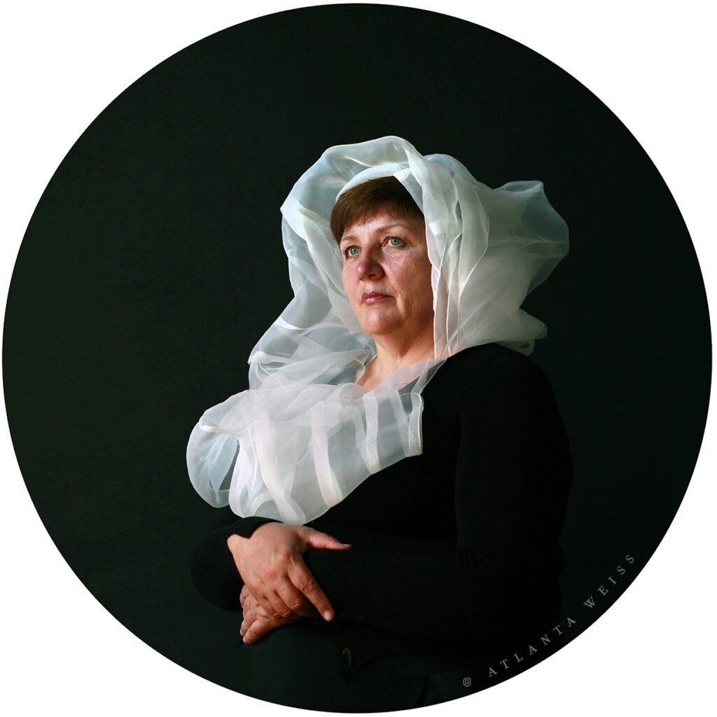 Portrait of a woman (Lucy) seated against a dark background, wrapped in a translucent white veil, circular crop, soft side light — photographic work by Atlanta Weiss.